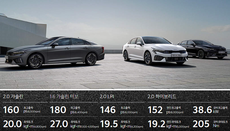 파워트레인 2.0 가솔린, 1.6 가솔린 터보, 2.0 LPi, 2.0 하이브리드 총 4가지이며, 기존과 구성이 동일하게 나왔습니다.